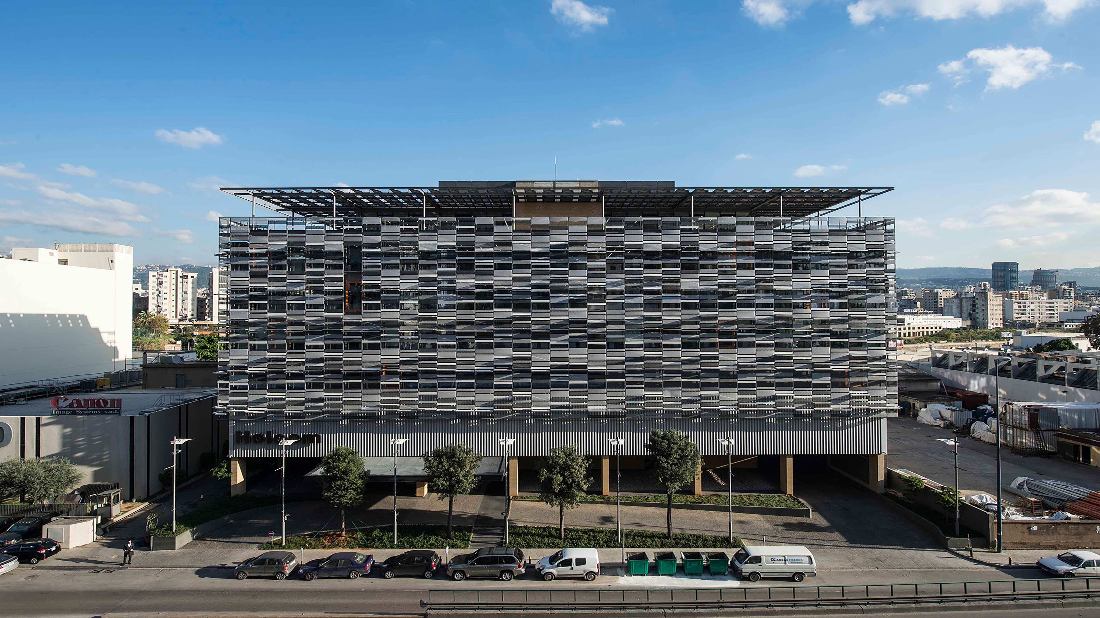 Set on a plot taken between two highways, Holcom Headquarters is composed of multipurpose flexible floors housing more than forty companies in a luminous and peaceful space. The building’s response to its noisy and chaotic industrial urban context is an introverted installation of two interconnected volumes abutting with the neighboring buildings. On the street side, the building is protected by a double skin façade, while on the inside it opens to an interior courtyard garden in the center of the building forming the heart of the project. It is a flagship building that stands out from its surroundings by its "pixelated" facade, composed of a set of metal panels and sunscreens, that protects against direct sunlight and noise while ensuring good brightness and transparency in offices. The project was awarded at the 2015 - 2016 Arabian Property Award in the "Office Architecture" category.